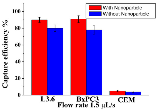 To demonstrate the efficiency among different types of cells with different sizes, we studied a mixture of pancreatic cancer cell lines: target L3.6pl cells, BxPC3 (EpCAM+), and control CCRF-CEM cells (EpCAM−). As shown in Figure 2, for L3.6pl cells (diameter 16 ± 3 µm), the capture efficiency was 91% ± 4.5% at 1.5 µL/s; for BxPC3 cells (diameter 16.0 ± 2 µm), the corresponding capture efficiency was around 88 ± 3.5%, while most control CEM cells (diameter 13.0 ± 2 µm) were removed by washing (capture of only 6.0% ± 2%). The possible reason is that the CCRF-CEM cells did not express EpCAM, and their sizes were slightly smaller than other cells tested. These results demonstrate that our device, conjugated with nanoparticles and anti-EpCAM, could efficiently isolate CTCs at low numbers by decreasing surface contact and increasing the binding efficiency. Furthermore, our methodology increased the surface roughness compared with the plain surface, allowing local topographic interactions between the aptamer and nanoparticle.