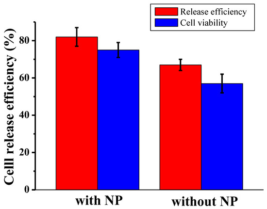 Release efficiency and cell viability of recovered L3.6pl cell in DPBS according to the presence and absence of nanoparticles, at a flow rate of 1.5 μL/s.