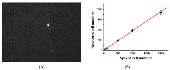 To assess the effectiveness of our CTC capture system in whole human blood, we conducted experiments using blood samples spiked with varying concentrations of L3.6pl cells under optimal conditions. Specifically, 2 mL of whole blood was spiked with L3.6pl cells at concentrations of 50, 100, 500, 1000, and 2000 cells per mL, and the samples were processed using the microfluidic device with a flow rate of 1.5 µL/s. Our results, presented in Figure 5B, demonstrate a strong linear correlation (R2 = 0.998, n = 3) between the number of spiked cells and the number of cells captured, with an average capture efficiency of 90% ± 3.5%. These findings suggest that our system can effectively capture CTCs from whole blood, even at low concentrations, and has the potential for use in clinical applications.