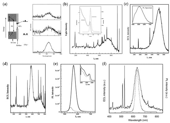 In the first work using Si QDs as ECL emitters reported by Bard’s group in 2002 [], the ECL spectrum was centered at 640 nm, showing a significant red shift from the PL peak (~420 nm). This phenomenon led to a conjecture that PL originates from band-edge states while ECL originates from surface states (Figure 1a). Subsequently, Bard’s group further confirmed this conjecture by exploring the ECL performance of CdSe QDs and Ge QDs. The ECL spectra of QDs were found to be red-shifted by ~200 nm in comparison with the PL spectra, implying that ECL emission of QDs predominantly arises from surface states, in agreement with previous studies (Figure 1b,c) [,]. However, a series of subsequent studies overturned this conclusion. Bard’s group believed that surface states are quenchers of luminescence and the passivation of surface defects is the key to the preparation of high-quality QDs. Thus, a shell of ZnSe with a wider band-gap was grown on the surface of the CdSe core in order to passivate the surface defects. The ECL spectrum of CdSe/ZnSe QDs displayed two peaks: a sharp one coincident with the PL spectrum and another broad one with a red shift of ~200 nm compared to the PL spectrum, arising from surface states and band-edge states, respectively. And the passivation of surface states favored the generation of band-edge emission (Figure 1d,e) []. Later, the ECL spectrum of CdTe QDs was found to locate at the same position as the PL spectrum, but slightly wider than that of the PL spectrum, indicative of the negligible involvement of surface states in ECL process of CdTe QDs (Figure 1f) []. Based on the above research works, it can be concluded that ECL emission of semiconductor QDs can come from both surface defect states and band-edge states, and the proportion of them in the luminescence process may depend on the passivation degree of surface defects.