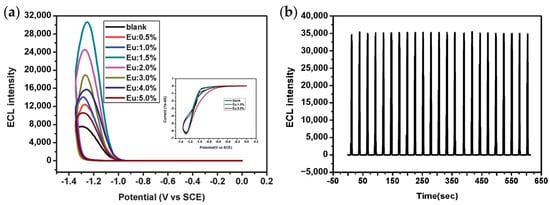 QDs synthesized directly in aqueous solutions tend to have poor optical properties and low ECL efficiency due to the low crystallization temperature. In order to improve the ECL properties of QDs dispersed in aqueous solutions, researchers explored a series of ECL enhancement strategies, including metal ion doping, surface passivation with bidentate ligands, construction of core-shell structures and complexation with other structures such as carbon nanotubes and graphene oxides [,,]. Xu et al. studied the ECL properties of ZnS QDs doped with Mn2+ in aqueous solutions using H2O2 as a coreactant for the first time []. Although the ECL intensity of Mn2+-doped ZnS QDs was not significantly enhanced, the introduction of Mn2+ surface states caused the onset potential of ECL generation to shift considerably, thus avoiding the decomposition of ECL intermediates at a negative potential. Later, it was found that Eu3+ was more effective than Mn2+ as a dopant in improving the ECL properties of QDs []. As shown in Figure 2, the doping of Eu3+ causes a four-fold enhancement in ECL intensity and more stable cathodic signals compared with pure CdS QDs.