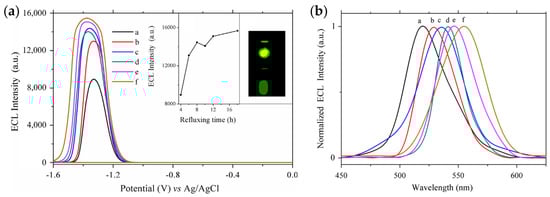 The dependence of ECL behaviors (a) and normalized ECL spectra (b) of dual-stabilizers-capped CdSe QDs on the refluxing time of (a) 4, (b) 6, (c) 8, (d) 10, (e) 12 and (f) 18 h. Reprinted with permission from ref. []. Copyright 2014 Elsevier.