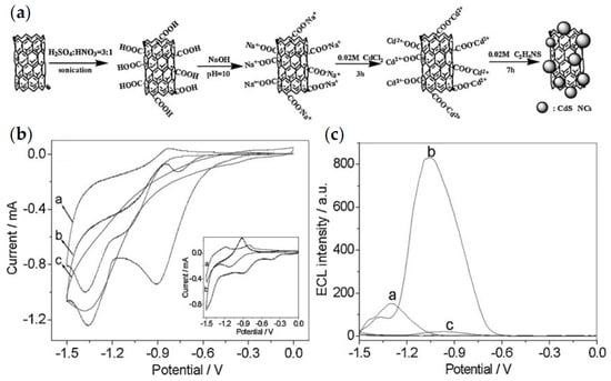 (a) Procedure of the preparation of CdS QDs on the modified multi-walled carbon nanotubes (MWCNTs); (b) CVs of (a) CdS QDs modified paraffin-impregnated graphite electrode (CdS-PIGE), (b) MWCNT-CdS-PIGE and (c) MWCNT-PIGE in 0.1 M PBS (pH 7.4) containing 1 mM H2O2. (c) ECL behaviors of (a) CdS-PIGE and (b) MWCNT-CdS-PIGE in 0.1 M PBS (pH 7.4) containing 1 mM H2O2 and (c) MWCNT-CdS-PIGE in 0.1 M PBS (pH 7.4) without H2O2. Reprinted with permission from ref. []. Copyright 2009 WILEY-VCH Verbg GmbH & Co. KGaA, Weinheim.