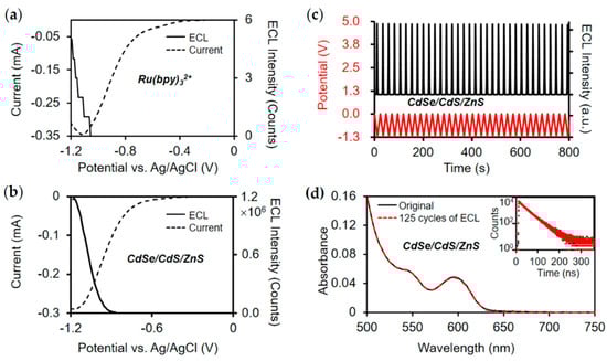 ECL performance of CdSe/CdS/ZnS QDs. (a,b) Current and ECL intensity curves of CdSe/CdSe/ZnS QDs and Ru(bpy)32+ under identical conditions. (c) Stability of ECL generation over multiple cycles of potential sweeping between 0 and −1.2 V. The red curve represents the variation of externally applied potential, and the black curve shows the recorded ECL intensity. (d) Steady-state absorption and transient PL (inset) spectra of QDs before and after 125 cycles of potential scan between 0 and −1.2 V. The black curves and red curves represent the original data and the data after 125 cycles of ECL test, respectively. Reprinted with permission from ref. []. Copyright 2020 American Chemical Society.
