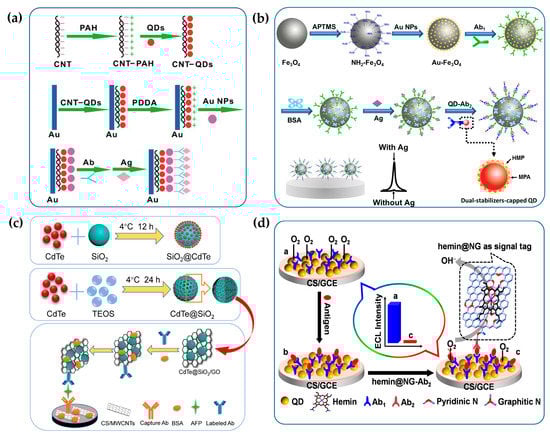 In addition, due to the extremely low concentration of antigens in biological samples and the limited number of QDs labelled on secondary antibodies, various signal amplification strategies have been developed to improve the detection sensitivity of trace antigens [,]. As shown in Figure 6c, a novel immunosensing strategy for α-fetoprotein (AFP) is proposed to achieve ECL signal amplification by enriching QDs with SiO2 nanoparticles. Specifically, MWCNTs are first modified to the glassy carbon electrodes (GCE) to bind with the primary antibody and then CdTe QDs-functionalized SiO2 nanoparticles are combined with GO to conjugate the secondary antibody. MWCNTs can accelerate electron transfer between CdTe QDs and electrodes. The combination of CdTe QDs-functionalized SiO2 nanoparticles and GO can not only increase the ECL intensity of a single label but also provide sufficient binding sites for the conjugation of secondary antibodies. Dual signal amplification strategies significantly improve the sensitivity of AFP immunoassay. In addition, QDs can be enriched by encapsulating them in porous nanostructures, thereby amplifying ECL signals and improving detection sensitivity. For example, Liu et al. combined SnS2 QDs and MOFs into the construction of ECL immunosensors to achieve synergistic amplification of ECL signals with K2S2O8 as a coreactant []. The MOFs served not only as carriers to enrich ECL luminophores but also as catalysts for oxygen reduction to promote the ECL generation of SO4•−/O2 system, eventually realizing the ultrasensitive detection of the carbohydrate antigen 24-2 with a detection limit of 0.015 mU/mL. Deng et al. developed an ECL immunosensor for the detection of procalcitonin using manganese dioxide nanoflowers and ZnS QDs as dual ECL emitters []. In this strategy, abundant Au nanoparticles (AuNPs) and ZnS QDs were incorporated into the nanoflowers to improve the conductivity and ECL efficiency. Meanwhile, manganese dioxide nanoflowers could act as ECL emitters and co-reaction accelerators to further amplify the ECL signal, achieving the sensitive detection of procalcitonin with a detection limit of 0.033 pg/mL.