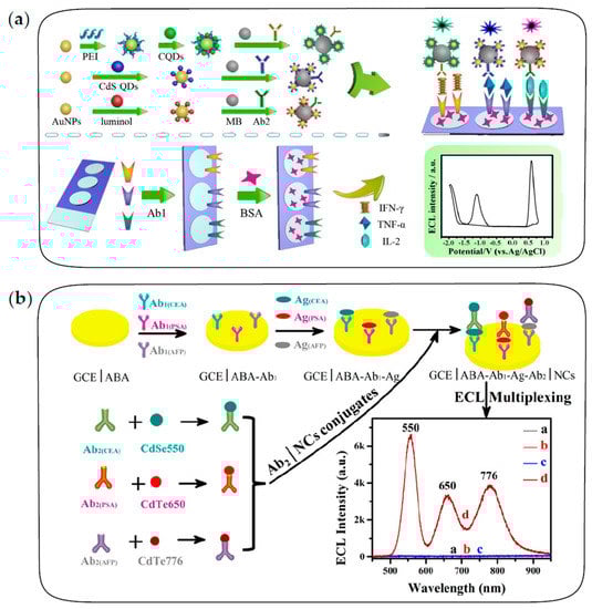 The ECL immunosensor discussed above can only achieve the detection of a single antigen in a single run. In fact, the demand for simultaneous detection of multiple targets in immunodiagnostics has increased rapidly, which puts forward higher requirements for the signal-resolving strategies of multiple ECL emitters []. According to the difference in signal-resolving strategies, the multiplex immunosensors based on the ECL of QDs can be divided into potential-resolved and wavelength-resolved formats, both of which depend on the adjustment of the band gap by tuning the size and composition of QDs [,,,].