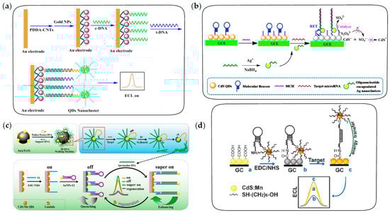 Another type of QD-based ECL biosensor for nucleic acid analysis is constructed through the specific recognition of the target by hairpin DNA. In this strategy, the film of QDs with stable ECL emission is generally coated on the electrodes, followed by target-induced ECL enhancement or quenching to achieve a sensitive response of the ECL intensity to the target. Currently, ECL quenching strategies reported in the literature include RET effects and competitive consumption of coreactants, while ECL enhancement strategies are mainly based on the LSPR effect [,,,]. Among them, the RET quenching effect and LSPR enhancement effect are both derived from the interaction between noble metal nanocrystals and ECL emitters. The dominant effect mainly depends on the distance between the noble metal nanocrystals and ECL emitters. Generally, the RET effect dominates at short range, while the LSPR effect dominates at long range. For instance, Xu et al. first proposed a distance-dependent ECL quenching or enhancement strategy based on the interaction between AuNPs and CdS:Mn QDs for DNA detection []. As shown in Figure 8d, hairpin DNA with AuNPs labeled in the terminal was covalently attached to GCE modified with CdS:Mn QDs by amidation. Upon the occurrence of the hybridization with target DNA, ECL quenching arising from the RET effect at short range was converted to ECL enhancement arising from the LSPR effect at long range, the combination of which provided a high sensitivity for DNA detection.