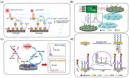 In this strategy, the concentration of target molecules is correlated with the concentration of coreactants and thus with the ECL intensity of QDs, which can be achieved either by considering target molecules as coreactants or by the target-induced consumption or production of coreactants. For example, DBAE and TPrA were sensitively detected as ECL coreactants of CdTe and ZnSe QDs, respectively [,]. In addition, an ECL biosensor for the detection of glucose was constructed based on the competitive consumption of dissolved oxygen, which acted as a coreactant in the QD-based ECL process []. As shown in Figure 9b, under the catalysis of glucose oxidase, the oxidation of glucose leads to the consumption of a large amount of dissolved oxygen and the production of H2O2. Due to the higher efficiency of dissolved oxygen as a coreactant than H2O2, the ECL intensity of QDs decreases in the presence of glucose, resulting in a sensitive response of the ECL biosensor to glucose. Alternatively, AuNPs are efficient glucose oxidase-mimics to catalyze the oxidation of glucose, which can also be used to construct ECL biosensors for the detection of glucose based on the competitive consumption of dissolved oxygen []. Moreover, as shown in Figure 9c, due to the selectivity of D-amino acids oxidase on the oxidation of D-amino acids rather than L-amino acids, the isomers of chiral amino acids can be effectively discriminated and quantified based on the ECL response of CdSe QDs [].
