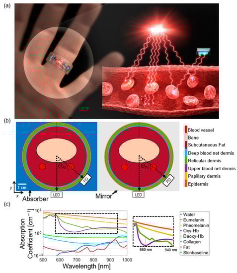 (a) Schematic illustration of the finger-type wearable RPO (left) and optical measurement process (right). The right figure shows optical irradiation of blood vessel via an LED, containing red blood cells, and detection of diffused light via scattering, absorption, and reflection by a PD; (b) cross-sectional simulation domains for the finger structure without (left) and with the surrounding mirror (right). The angular separation between PD and LED is defined by θPL. A detailed structural geometry with cross-sectional tissue composition is available in Appendix B; (c) absorption spectra of constituent elements within the tissue.