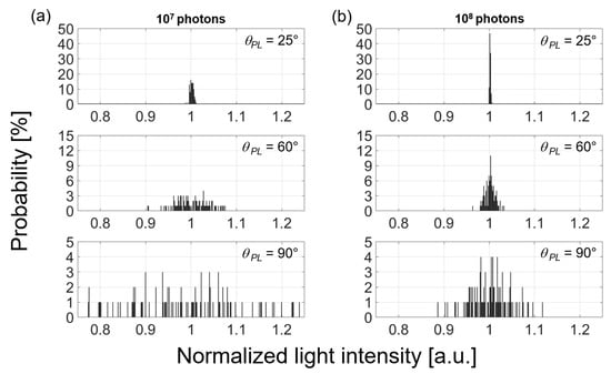 Calculated probability distributions of the detected light intensities along the number of photons (107 and 108) shown in (a,b), respectively, each of which is displayed with three different θPL. A single event of optical transmission from LED and detection at PD was repeated 100 times. An average of detected intensity was set to 1 (i.e., shown as a center of horizontal axis). For example, the top-left figure (107 number of photons and the angular separation of 25°) shows that the average value (1.0) was detected 22 times among 100 events (i.e., 22%).