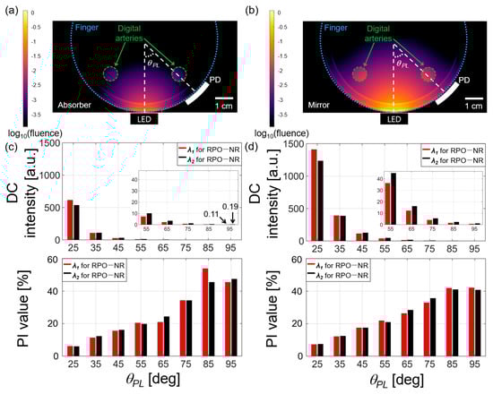 Then, we performed 3D simulations for RPO-NR and RPO-R configurations in order to find the dc light intensity and the PI value (Figure 4). Cross-sectional views for the dc intensity distributions are shown in Figure 4a,b. In the simulation, we assumed a fully absorbing medium that surrounds the finger in RPO-NR (i.e., 100% absorption), and a fully reflective surrounding medium in RPO-R (i.e., 100% reflectance). The comparison of two dc intensity distributions in Figure 4a,b confirms that RPO-R greatly enhances the detected light intensity via PD, which is boosted by strong reflection at the finger–mirror boundary. For example, when the dc intensities at θPL = 25° are compared for both cases of RPO-NR (Figure 4c) and RPO-R (Figure 4d), RPO-R exhibits relatively enhanced intensities ΔIdc which are 129.7% for λ1 = 660 nm and 130.3% for λ2 = 940 nm, respectively. Although the intensity drops rapidly with θPL due to photon absorption and scattering in the tissues, a several-fold enhancement is observed over the entire angular range.