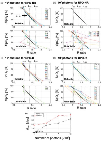 SpO2 versus R ratio (calculation) shown with reliability limits in (a–d), i.e., denoted as vertical dotted lines determined from the calibration curve (C. C.). All the calculation was performed assuming four different SpO2 measurements (70, 80, 90, and 100%): (a) RPO-NR with 108 photons; (b) RPO-NR with 107 photons; (c) RPO-R with 108 photons; (d) RPO-R with 107 photons; (e) the maximum angular separation of θPL (=θmax) versus the given number of photons for RPO-NR (black dotted line) and RPO-R (red dotted line). The R ratio was obtained for a fixed angular location of PD (θPL) (i.e., each single curve consists of four data points obtained along with the SpO2). The R ratio calculation was repeated over θPL = 25°~95°. A calibration curve for SpO2 (the thick, black line marked as C. C.) is common for all figures from (a–d).