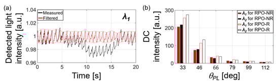 Experimentally measured light intensities (an example from one participant) when SpO2 > 95%: (a) PPG signals for RPO-R represented in a measured raw form (black) and its filtered form (red; a bandpass filter applied over a frequency range of 0.7–4 Hz). These were obtained with λ1 = 660 nm and θPL = θ1 (i.e., 33°); (b) Intensities of dc signals obtained at different θPL (set by six PD locations along the ring).