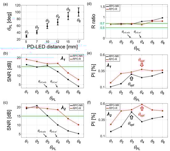 Figure 7d shows the result for R ratio. As the reliability of R ratios were previously set as 0.5–0.7 [21,22,32,33] for SpO2 > 95%, we utilized such range shown as green solid lines in Figure 7d. In our measurement, this range was satisfied when θPL θcrit,w/o for RPO-NR and θPL θcrit,w/ for RPO-R. This means that the common reliable range of SNR and R ratios are obtained when θPL 60° for RPO-NR and θPL 70° for RPO-R, respectively.