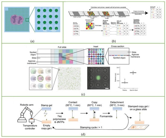 It is worth noticing that the autonomous device built for the stamping process includes a desktop robotic arm to adjust the seal position, a thermal cycler to control the gel temperature, a digital balance to monitor the stamping pressure, and a fluid system to amplify DNA, which is shown in Figure 2d. Therefore, this method made great progress in spatial transcriptomics techniques in terms of automation, cost savings, and efficiency.