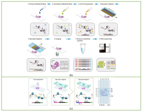 Based on DBiT-seq, Fan Rong’s group continued to extend this method to study histone modification at spatial resolution []. The Spatial-CUT&Tag method combines in-tissue deterministic barcoding technology with cleavage under targets and tagmentation (CUT&Tag) chemistry. The first antibody is added to the fixed tissue section to bind to the target histone modification, and then the second antibody is combined with the first antibody to enhance the tethering effect of pA-Tn5 transposase. After the transposase is activated, the ligation linker is inserted into the genomic DNA (gDNA) at the histone marker antibody recognition site. Using the same method as DBiT-seq, barcode A and barcode B are passed into the microfluidic chip to hybridize with the adapters in situ. Then, the tissue is imaged to construct a map of histomorphology and the spatial transcriptome. Finally, the DNA fragments are released by reverse cross-linking and collected to complete library construction. The schematic workflow is displayed in Figure 4b.