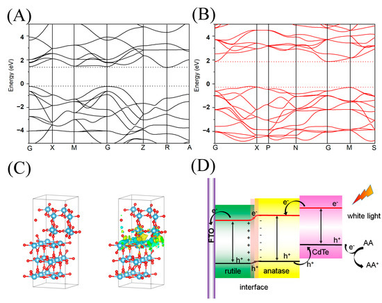 DFT calculations were performed to study the band structure of the rutile and anatase phases and charge distribution within the branched RA-TiO2 phase-structure electrode. In Figure 5A,B, the conduction band bottom of the rutile phase was lower than that of the anatase phase by ~0.5 eV, whereas the valence band top was similar. The band arrangement of the electrodes showed the characteristic of II-type heterojunction. To demonstrate the role of the branched RA-TiO2 phase-structure electrode in signal collection, the differential charge density at the interface between rutile (110) and anatase (101) was simulated. As shown in Figure 5C, the calculation models were built by cutting rutile TiO2 crystal along with rutile TiO2 (110) and anatase TiO2 (101). The results of differential charge density of the model demonstrated that electrons gathered at the anatase (101) surface, whereas holes gathered at the rutile (110) surface and brought them together. The self-built electric field was established at the interface to provide a driving force for the collection of electrode signals. Therefore, as shown in the electron transfer diagram in Figure 5D, when there was no target in the detection system, the hairpin probe DNA riveted CdTe QDs on the surface of the electrode. The TEM images presented in Figure S1 reveal that the CdTe QDs were regular spherical structures with diameters of about 2–5 nm and the SEAD diffraction pattern indicates that the CdTe QDs were polycrystalline powders. The photoexcited electrons from the CdTe QD conduction band entered the conduction band of anatase TiO2 and were then received by the FTO electrode through the rutile NRs. The formation of the rutile/anatase/CdTe-sensitized structure significantly improved the photoelectric response of the electrode. However, the hairpin probe DNA hybridized with the target DNA to form a hard-to-bend double-stranded structure, forcing CdTe QDs off the electrode surface and resulting in a significant decrease in electrode photocurrent. With the aid of the branched RA-TiO2 phase-structure electrode, the electrochemical signals in the detection process could enter the electrode more smoothly and efficiently.