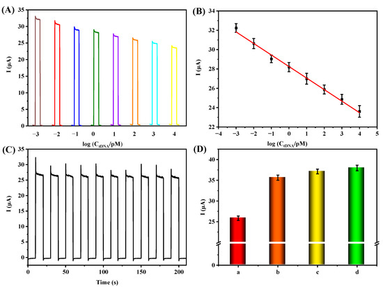 (A) Photocurrent signals of the sensing platform with different concentrations of target DNA, (B) relationship of photocurrent versus logarithm of target DNA concentration, (C) stability test of the electrode with 10 μM target DNA, and (D) selectivity test of the electrodes.