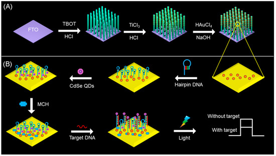 Photoelectrochemical (PEC) biosensors have been universally regarded as a reliable tool for the analysis of various biomarkers, such as antigens [1,2,3], nucleic acids [4,5,6,7,8,9], enzymes [10,11], and some other chemicals [12,13,14]. PEC biosensors uniquely possess the advantages of low background signals, inherent miniaturization because of unique light excitation, and current detection pattern [15]. As a catalytic and transducer element, the photoactive electrode material plays an important role in the PEC biosensor. TiO2 is widely researched for electrode materials because of its chemical stability, photocatalytic activity, and biocompatibility [16,17,18,19]. However, electrodes prepared from TiO2 powder usually suffer from structural defects and charge recombination [20].