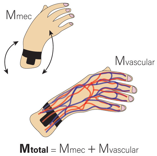 According to Equation (1), there are thus two main sources of the motion artifacts: on the one hand, the displacement of the sensor relative to the skin (Mmec), which causes a change in the angle of incidence and the light path and which would correspond to the d term in Equation (1). On the other hand, the internal deformation and structural change of certain tissues due to finger movement (Mvascular), which produces an artifact in the signal and which would correspond to the c term. Figure 2 shows a simplified model of the previous point, where it is shown that the total motion artifacts are the sum of the artifacts caused by the displacement of the sensor and the artifacts caused by the changes in the microvascular tissues due to the movement of the fingers.
