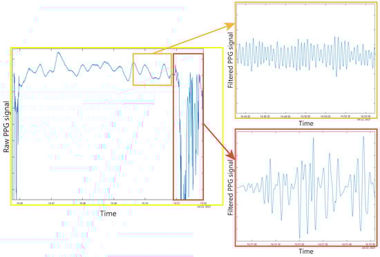 Due to the special characteristics of the users for which the physiological signal monitoring device has been developed, the device is attached to the user’s wrist in a soft manner since an excessively strong attachment may mean that the individual will not be able to tolerate the use of the system. This means that the signal intensity may be lower than the desired, and it will cause the signal to be even more sensitive to possible user movements. These conditions may mean that the obtained HR signal from the user during a monitoring period is partially corrupted or even almost entirely corrupted if the subject is uncooperative and the tasks performed are very intense. An example of this problem can be found in Figure 3, which shows a graph of the PPG signal measured on the wrist of a user during a test session. It can be seen how the shape of the signal changes throughout the session as the individual performs different activities during the session. If we try to apply common filtering (bandpass filter + median filter + low FIR filter) to the signal in different parts of the session, we will find different results for the different performed tasks. The orange rectangle corresponds to a time window where the user performs an activity with a low level of arm, wrist, and finger movement. It can be seen how, after applying the different filters to this part of the raw data, a clean signal is obtained, with a sinusoidal shape, and where the HR can be calculated with high confidence in the value. However, if we apply the same filters to a window corresponding to an activity where the user has performed constant movements of the arm, wrist, or fingers (red rectangle), the obtained signal is corrupted and, therefore, the HR calculation will probably have a result far from the real value and with very low confidence.