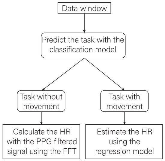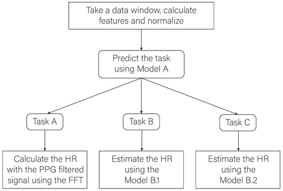 Figure 10 shows a conceptual scheme where the final workflow of the proposed algorithm can be seen. Data collected in a time window of 6 s are processed to extract features and subsequently normalize them. A classifier is then trained to identify the task the participants are performing. Depending on the task that the user is performing and on the basis of the results obtained in the evaluation phase, three different ways to calculate the user’s HR are adopted. In particular, the calculation of the HR is carried out by applying the FFT of the filtered PPG signal if the classification model recognizes that the user is performing a task of group A, i.e., is at rest. The calculation of the HR will be carried out using one of the previously trained regression models if the result of the classification model is that the user is performing a task from groups B or C. In case the task belongs to group B, model B.1 will be used. It corresponds to the model generated with the Gaussian process regression algorithm, which has a better estimation performance for activities with lower FC value ranges. Instead, model B.2 will be used when the predicted task corresponds to group C. model B.2 corresponds to the model generated with the bagged trees algorithm, which performs better in activities where the HR values are higher.