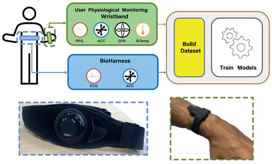In order to train the predictive models for the algorithm, having a sufficiently large and high-quality dataset is necessary so that the training of the models can be optimal and the results can be accurate enough to incorporate the work in the platform. For this purpose, an experiment has been carried out where different users have performed certain tasks while wearing the personal monitoring device presented before and also have installed the Zephyr BioHarness by Medtronic device [28]. This device consists of a chest strap and provides the user’s HR signal from the ECG measurement. This signal is used as the ground truth to evaluate HR in order to train the regression model in a supervized manner. BioHarness was selected since it is unobtrusive for the participants and has high accuracy in estimating HR. Numerous studies in the literature have already proven its validity at finding standard errors of measurement bpm during high physical activity [29,30].
