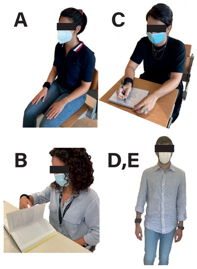 Pictures of users carrying out the different activities proposed for data recording ((A): Rest, (B): Read, (C): Write/Draw and (D,E): Walk slow,fast).