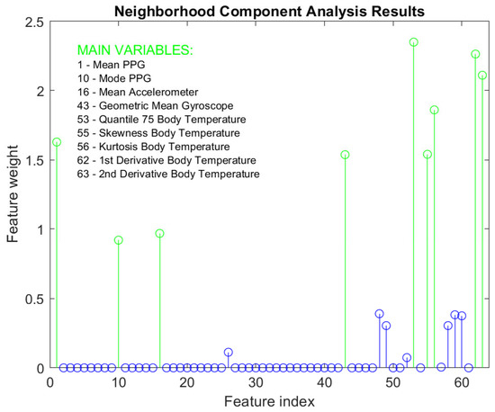 Before training begins, a dimensionality-reduction algorithm is applied to establish which features in the dataset are the most important for the purpose of the model. The used algorithm is the neighborhood component analysis (NCA), a specific method for classification problems, which groups the features based on the results of the dimensionality reduction. It uses the variance of the components to estimate the number of clusters, similar to the k-means algorithm. NCA has been chosen since it offers several advantages over other similar methods in the literature. In particular, NCA allows for a targeted reduction in the dimensionality of the data, selecting the most informative features for activity identification and heart rate calculation. The algorithm takes into account local dependencies between data instances, allowing the most relevant features to be identified based on specific contexts or movement patterns. Another advantage of NCA is its supervized approach, which exploits the labeled information of the training data to guide the selection of relevant features. Compared to principal components analysis, NCA is more suitable as it is specifically designed to select the most relevant features for the task of interest, taking into account local dependencies between data instances. NCA, which directly identifies the most informative features by maximizing the separability of classes or target values, outperforms the recursive feature elimination approach [36], which recursively eliminates the least relevant features. Figure 7 shows the result of applying the algorithm to the training dataset. The weights of the different features according to their importance in classifying the activity can be seen. Those features that have a higher returned weight via the algorithm have been selected. This corresponds to the 9 attributes that are highlighted in green in the graph and listed together with their corresponding feature index.