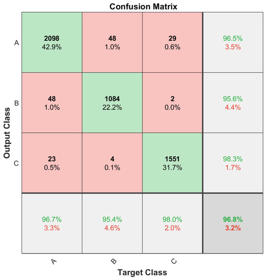 The first of the models that makes up the proposed algorithm is in charge of classifying between each input into one of the three different task groups. For training, class 1 has been assigned to the group of resting tasks, class 2 to the group of tasks with specific finger movements, and class 3 to the group of tasks with user displacement. In addition, the “k-fold” cross-validation with a k equal to 5 has been used for the validation of the models during training.