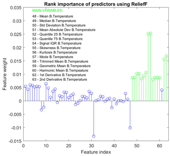 The second model that forms the proposed algorithm consists of a regression model that estimates the HR value. For the training of this model, the HR value measured by the BioHarness is used as the output label. As with the training of the classification model, 5-fold cross-validation has been used to validate the models during training. Before the training, a dimensionality-reduction algorithm is again applied to establish which are the most important features of the dataset for the new target. In this case, the ReliefF algorithm [38] has been used. This algorithm penalizes predictors that assign different values to neighbors with the same response value and rewards predictors that assign different values to neighbors with different response values. Figure 9 shows the result of applying the algorithm to the training dataset. The weight of the different features can be observed according to the importance assigned by the ReliefF algorithm for the estimation of the HR. As in the classification model, the most relevant features have been selected. In this case, the algorithm returns a different scale than the one used in the classification model. The 15 selected features are highlighted in the graph in green and are also listed together with the corresponding feature index. It can be seen how the 15 selected features correspond to the body temperature variable. This seems logical since for the estimation of HR in situations where the PPG signal is corrupted, it does not provide valuable information to the model. The same occurs with the acceleration and gyroscope signals. These are signals that provide information to predict the task performed by the user but not to estimate the HR value.