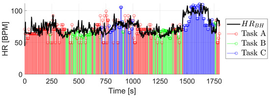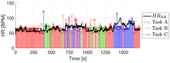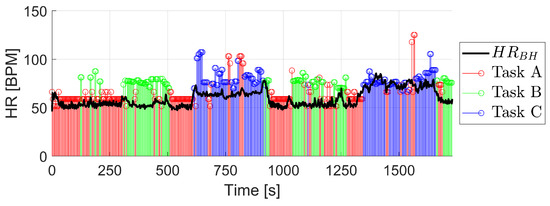 The results of the algorithm for this session are shown in Table 6. The classification of the task has been performed successfully 80.6% of the time, very similar to the rest of the sessions, with task C again being the best identified. Regarding the result of the calculated HR, the of the session is 13.03 BPM, increasing for task C due to the previously analyzed reason.