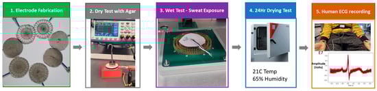 A graphical overview of our textile electrode evaluation study showcasing fabrication, impedance tests under different conditions, and human ECG acquisition.