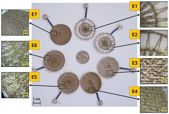 Seven different circular dry e-textile electrodes were evaluated in this study, along with zoomed images showing their structures. (Yellow embroidered [E1–E6], green knitted [E7].)