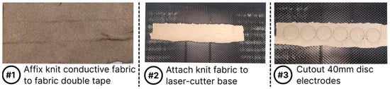 We cut out circular knit electrodes (E7) with a diameter of 40 mm from Medtex 180 silver-plated nylon fabric with high surface conductivity (<5 Ω/sq cm). The glowforge computerized laser cutter was used to cut the electrodes from the fabric. The knit conductive stretch fabric was taped to the edges of the laser cutter base, as seen in Figure 4. Since this study seeks to understand the effect of contact forces on the electrode impedance, it is vital to ensure any force applied is distributed evenly. The ideal type of connector for this study should ensure reliable electrical contact while also maintaining even distribution of force applied by load weights. We chose textile lead connectors over the regular snap lead connectors for this study. We embroidered the textile lead connector separately using the industrial embroidery machine with running stitches of conductive thread that linked two 4 mm conductive pads. The conductive thread channels were insulated using navy-blue polyester thread that formed satin stitches with 2 mm width over the conductive running stitches. In order to obtain measurements from the textile electrodes, the textile lead connectors were stitched to the electrodes. We used the Madeira HC40 conductive thread to stitch the conductive pads of the lead connector in the middle of each dry electrode using a desktop sewing machine (Brother SE1900). Table 2 details the thickness associated with the dry electrode measured using a fabric thickness gauge across 15 different points in the electrode.
