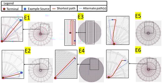 Example of conduction paths available within the embroidered electrodes (E1–E6).