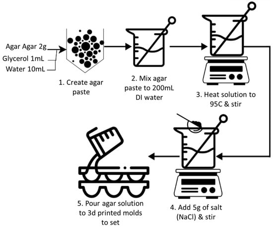 The process involves first mixing 2 g agar (lab-grade) with 1 mL of glycerol and 10 mL of deionized (DI) water to create a paste. Next, the paste is dissolved in 200 mL DI water which is heated to 95 °C while being stirred. Once the temperature reaches 95 °C, 5 g of sodium chloride (Sigma Aldrich, St. Louis, MO, USA) is stirred into the solution as it cools to room temperature. The solution is then shortly added to the 3D-printed electrode molds and allowed to solidify in isolation for 48 h at room temperature. The 3D-printed mold used was a cuboid (outer dimensions: 60 × 50 × 25 mm) with a hollow interior (inner dimensions: 50 × 40 × 20 mm) with an inner cavity for the internal gel electrode snap and cable, as seen in Figure 7. The agar solution is poured onto the mold and left to cool and solidify for 48 h before testing.
