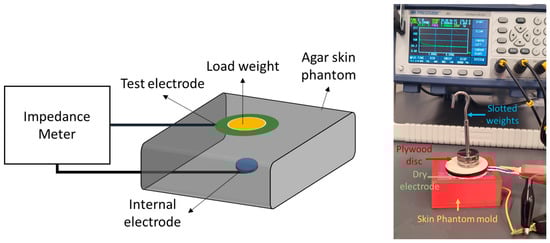 Figure 8 shows the impedance measurement setup with a dry electrode under load over a conductive agar phantom. Between each test session, the conductive agar phantom was immersed in deionized water.