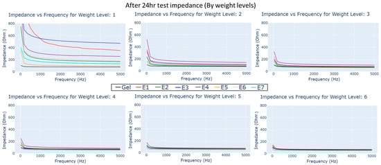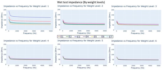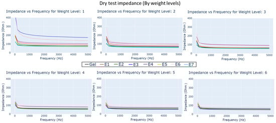 The impedance–frequency plots of electrodes under different load weights can be seen as subplots in Figure 11. The colors in the plot refer to different electrode types; it can be observed that in general the impedance reduces with higher frequency and weight levels (expanded further in Section 5).