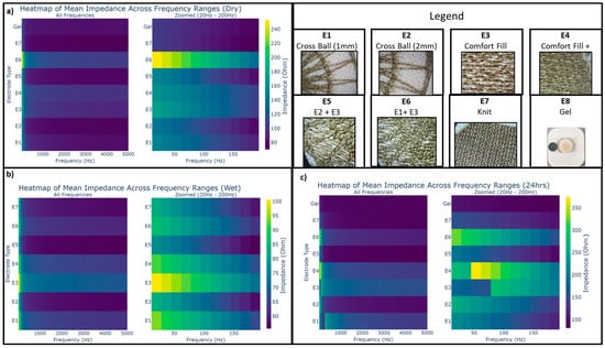 Mean impedance vs. frequency heatmap for dry and gel electrode types under different test conditions (a) dry impedance, (b) immediately after perspiration exposure, and (c) after perspiration exposure.