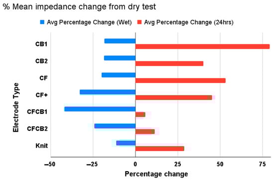 Upon conducting the impedance test 24 h after drying the electrodes in the conditioning chamber, an increase in impedance characteristics for each electrode type is observed for almost all electrodes, as seen in Figure 13 and Figure 15. A slight increase was expected due to the lower relative humidity of 65% within the conditioning chamber and due to electrode oxidation from perspiration exposure. The increase in impedance, however, varies significantly across different dry electrode types in comparison to their baseline measurements the day before exposure to perspiration. Cross ball electrode E1 (increase of 75%) followed by comfort fill electrode E3 (increase of 50%), E4 (increase of 45%), and cross ball electrode E2 (increase of 40%) showed a considerably higher increase in impedance compared to the baseline measurement. While knit electrode E7 (increase of 25%) only shows a moderate increase in impedance, hybrid electrodes that combined comfort fill with cross ball 2 mm E5 (increase of 10%) and cross ball 1 mm E6 (increase of 5%) show only a mild increase from the baseline.