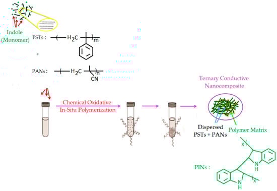 The reaction diagram of the synthesized ternary conductive PC (PST/PAN/PIN) is shown in Figure 1. The PST/PAN/PIN ternary PC was synthesized via the chemical oxidative polymerization method at 25 °C using the oxidant FeCl3. An oxidant-to-monomer mole ratio of 2:1 was used. In the first stage, 7.25 g of FeCl3 was dissolved in 30 mL chloroform in the reaction tube. In the next stage, 1.0 g of PST and 1.0 g of PAN were dissolved in 20 mL chloroform so that the total polymer mass was 2 g, and these were added to the oxidant solution mixed in the reaction tube. After the mixture in the reaction tube was stirred for 15 min, 2.62 g of indole monomer dissolved in chloroform was added dropwise to this mixture using a dropping funnel under N2 atmosphere at a fixed 25 °C reaction temperature. The product was separated by filtration from the reaction mixture, which was stirred for 30 h, and washed first with chloroform and then with hot distilled water. In the last stage, the obtained product was dried for 24 h at 45 °C in a vacuum oven.