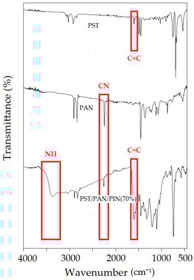 In Figure 2, the FTIR spectra of the PST, PAN and ternary PST/PAN/PIN composite (PC) are presented. In the PST FTIR spectrum, characteristic absorption bands were observed at 3030–2900 and 1600–1450 cm−1 attributable to the C−H stretching vibration and the C=C stretching vibration of the benzene ring, respectively, and these have been previously reported for PST [43]. The bands at 2252 cm−1 and 1616 cm−1 were recorded as the main characteristic peaks corresponding to C≡N and C–C bonds in the FTIR spectrum of PAN. For the PC, the existence of peaks at 1444 cm−1 is attributed to C=C, 2252 cm−1 is related to C≡N, and 3390 cm−1 belongs to N−H stretching in the PIN unit.