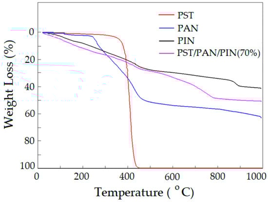 3.2. Thermogravimetric Analysis of PST, PAN, PIN and Ternary PST/PAN/PIN Composite