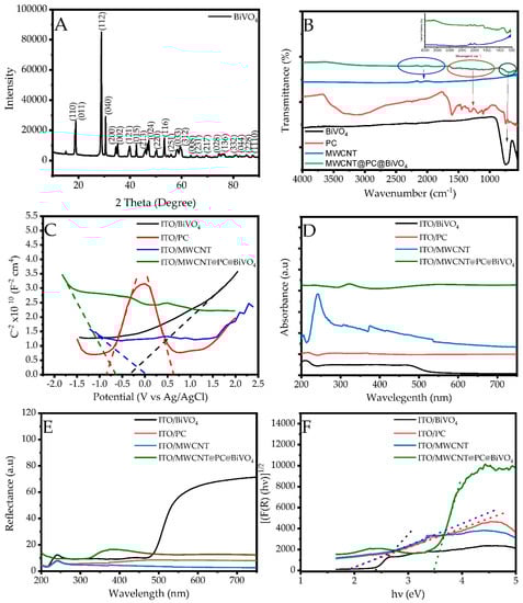 (A) XRD spectrum of BiVO4, (B) FTIR spectra of BiVO4, PC, MWCNT and MWCNT@PC@BiVO4 electrodes, (C) Mott-Schottky, (D) UV-Vis absorption spectra, (E) DRS spectra and (F) Kubelka–Munk graphs of prepared ITO/BiVO4, ITO/PC, ITO/MWCNT and ITO/MWCNT@PC@BiVO4 electrodes.