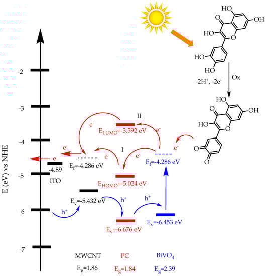 The energy diagram of the movements of electron and hole pairs in the developed sensor is shown in detail in Figure 5. Quercetin exposed to sunlight turns into quercetin-on quinone by donating electrons, and the released electrons flow over the flat band of BiVO4 semiconductor and then through PC and MWCNTs. In the BiVO4 structure, released electrons move through two different pathways. The main reason for this is that the synthesized PC structure behaves like a p-n junction. Electrons released in path I pass to the HOMO energy level of the PC, then pass to the flat band of the MWCNTs, and then flow through the external circuit and form an electrochemical signal. In pathway II, the oscillating electrons in the conduction band of BiVO4 pass into the LUMO energy band of the PC and then pass into the flat band of the MWCNTs, producing an electrochemical response. Holes (h+) formed due to electron movement move from the MWCNTs valence band to the PC valence band and then to the BiVO4 valence band. In particular, the synthesized PCs acting as a p-n junction allows for increased electron movement and improved sensor properties. In addition, it is clearly seen that the used BiVO4 NPs are light-sensitive due to their band properties [40,41,42]. The scheme shows that this new generation ITO/MWCNTs@PC@BiVO4 sensor developed should be effective in the quercetin analysis.