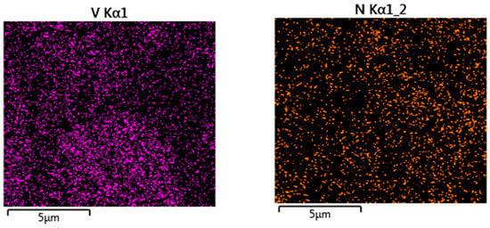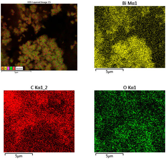 The field-emission scanning electron micrograph of synthesized BiVO4 NPs is shown in Figure 6A. BiVO4 NPs with a tetrahedral structure have a diameter range of 50–100 nm. In addition, the field-emission scanning electron micrographs of the electrode composite (MWCNTs@PC@BiVO4) are displayed in Figure 6B. The fiber-like structure that can be seen in the micrograph in Figure 6B belongs to MWCNTs, tetragonal structures to BiVO4 NPs, and small spherical structures to the polymer. The average particle size of the PC is 10–50 nm, and the MWCNT structure is 1–3 nm in diameter and 300–500 nm in length. In addition, the EDX spectrum of the electrode composite (Figure 6C) shows the elements that make up the composite and their combinations. The EDX spectrum also shows that the prepared electrode composite does not contain any impurities. In addition, the atomic and mass ratios of the atoms that make up the composite are shown in the inset of Figure 6C. Considering the atomic ratios, Bi and V elements originate from the BiVO4 NPs structure, and N from the PC. The C and O elements originate from the MWCNTs, PC and BiVO4 structure. Elemental mapping images of the prepared MWCNTs@PC@BiVO4 composite electrode are displayed in Figure 7. As seen in the elemental mapping images, each element is uniformly distributed in the composite electrode. It is observed that the N atoms, where the Bi and V elements are distributed together, are also less dense elementally than the other compounds and are distributed on the general composite.