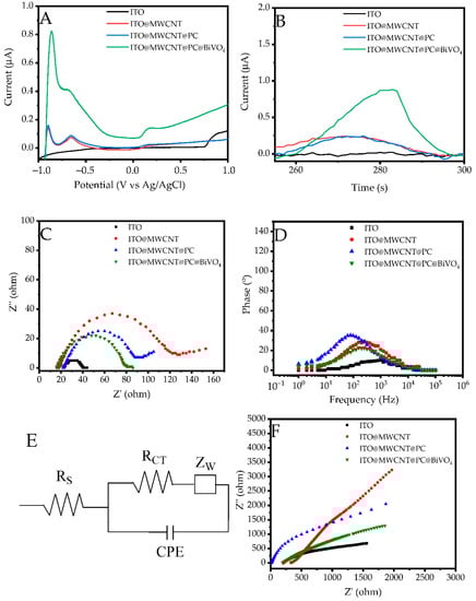 The τe and τd values calculated via Equations (2) and (3) are given in Table 1. Notably, the conductivity and electron mobility respectively increased by 20.03% and 1,45% after both MWCNTs and PC were secured on the electrode, compared to ITO/MWCNTs. Relative to ITO/MWCNT@PC, τe has increased by 282% after BiVO4 NPs were included on the electrode. As τe is a feature that represents the movement of the electron in the circuit along the circuit, it is a parameter that will aid in enhancing the conductivity of the sensor. Similarly, τd for ITO/MWCNT@PC@BiVO4 structure is the highest compared to all other electrodes. The main reason for this is every additional component added to the structure affects the cut-off time. When both τe and τd values are evaluated together, it is seen that they have an effect on increasing electrochemical conductivity under light. It can be said that especially BiVO4 NPs in the sensor structure increase electron movement and electron capture due to their photosensitive nature. The equivalent circuit model of the fabricated composite ITO/MWCNT@PC@BiVO4 electrode is shown in Figure 8E. This model was obtained by simulating the Zview program. In this model, RS, RCT, ZW and Cμ represent the layer resistance, the ITO/electrode surface charge transfer resistance, the Wargburg impedance value of the ion diffusion, and the capacitive phase element values, respectively. Dark mode impedance results are depicted in Figure 8F. These curves also show similar properties with the impedance results obtained under light. It is seen that the resistance values are lower for the measurements taken under light, whereas the dark impedance measurement results show higher resistance values. Similarly, it is observed that the ITO/MWCNT@PC@BiVO4 electrode exhibits lower resistance in the dark Nyquist curve than the other electrodes. It should be noted that the resistance of the ITO electrode, which is not coated with any material, is approximately 55% lower than the ITO/MWCNTs@PC@BiVO4 electrode.