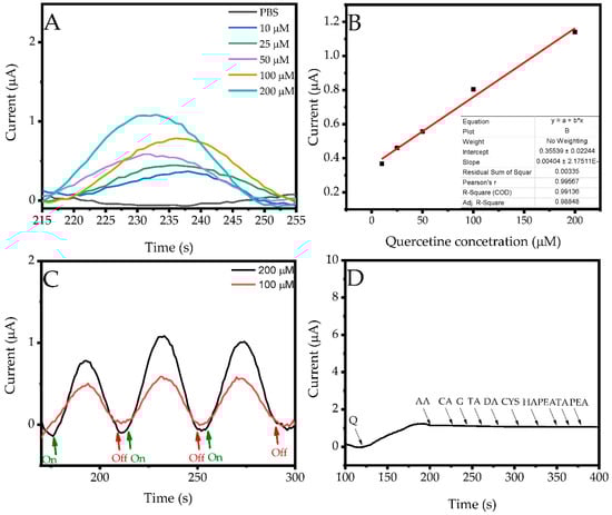 (A) Amperometric I-t curves, (B) calibration curves of different concentrations of quercetin, (C) on-off switching curves and (D) interference study.
