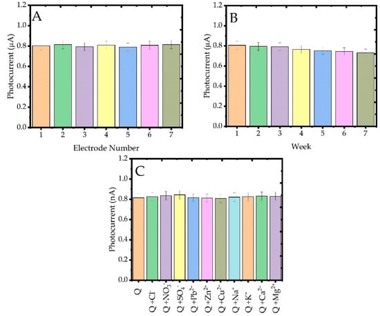 (A) Reproducibility, (B) long-term stability and (C) interference studies with different ions of the fabricated photosensitive quercetin sensors.